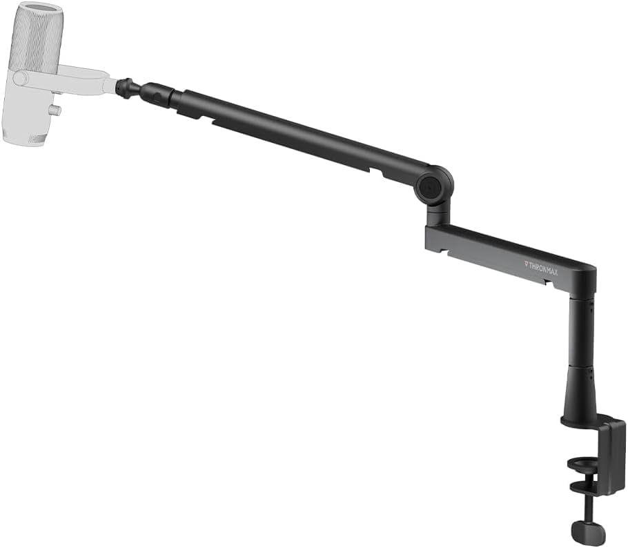 Streamlined design with internal springs and integrated cable channels. Fully adjustable ball head and swivel base. Extra tall: 750 mm / 29.5 in vertical reach to extend over most monitors. Included riser elevates the arm by another 150 mm / 5.9 in. The custom counterweight adapts the arm tension to the mic weight.